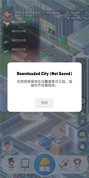 5、城市完成后即可自动进入城市之中,此时会弹出城市数据还未保存的提示,我们手动保存至存档之中即可