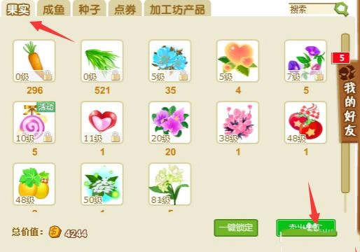 8、最后在新窗口中选中第一个果实,就能看到刚才从好友那里偷来的菜和果实了,右下方还可以将它们卖出换取金币。