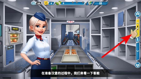 1、进入游戏界面后,点击餐食设备区域准备汉堡,这是开启空乘服务的关键操作,准确点击才能进入餐食准备流程。