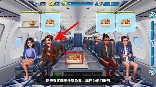 4、按箭头指引将对应餐食锦缎果推送至需求乘客处,完成乘客的餐食服务,推进空乘关卡的流程。