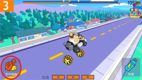 玩家驾车飞到空中,左边的方向盘图标会变成空中特技图标,按下可展示空中特技,增加分数。