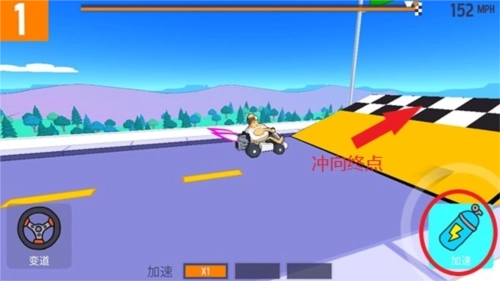 玩家点击右边加速图标即可增加速度,一共有三个档次,连按三下即可达到最高档,按下加速冲过终点。